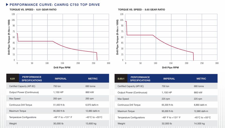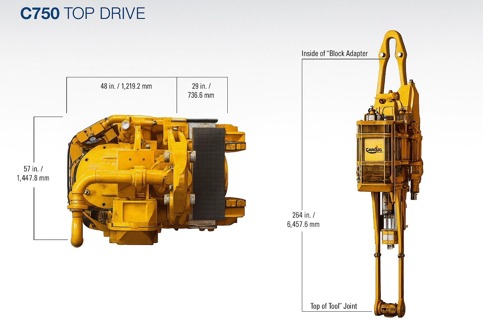 Sistema top drive 750 ton de última generación Marca CANRIG para operaciones eficientes.